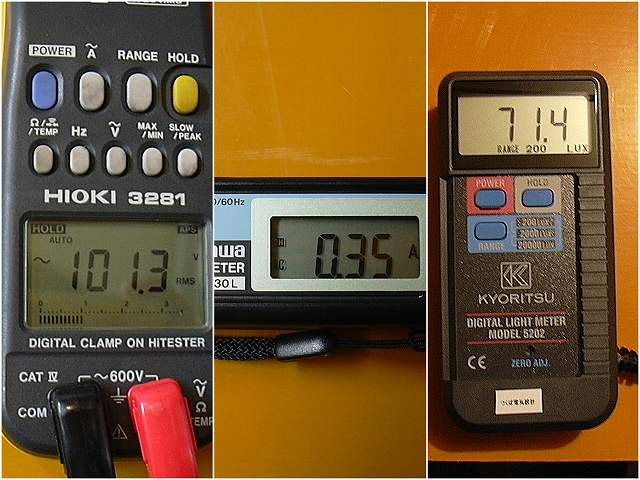 測定結果は電圧:101.3V 電流:0.35A 明るさ:71.4luxと