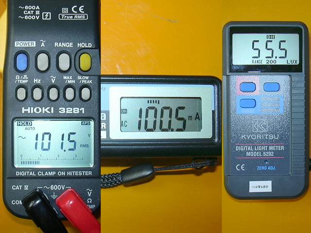 電圧:101.5V 電流:100.5mA 明るさ:55.5luxという結果に
