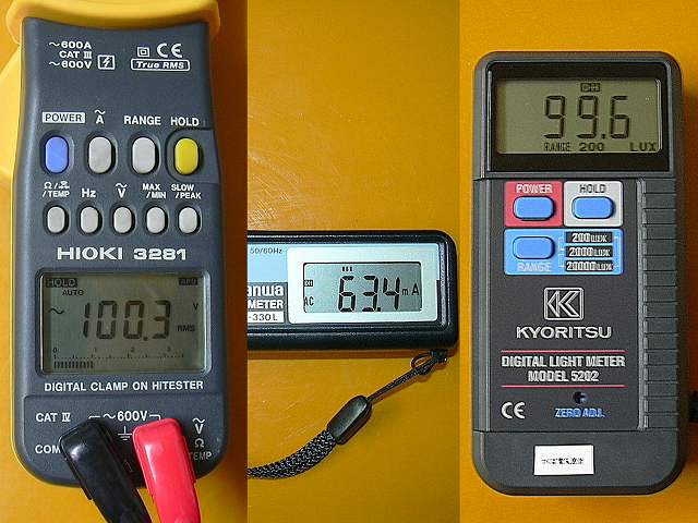 電圧:100.3V 電流:63.4mA 明るさ:99.6luxという結果になりました。前回より良い測定結果なのは気温のせいもあるのでしょうか?